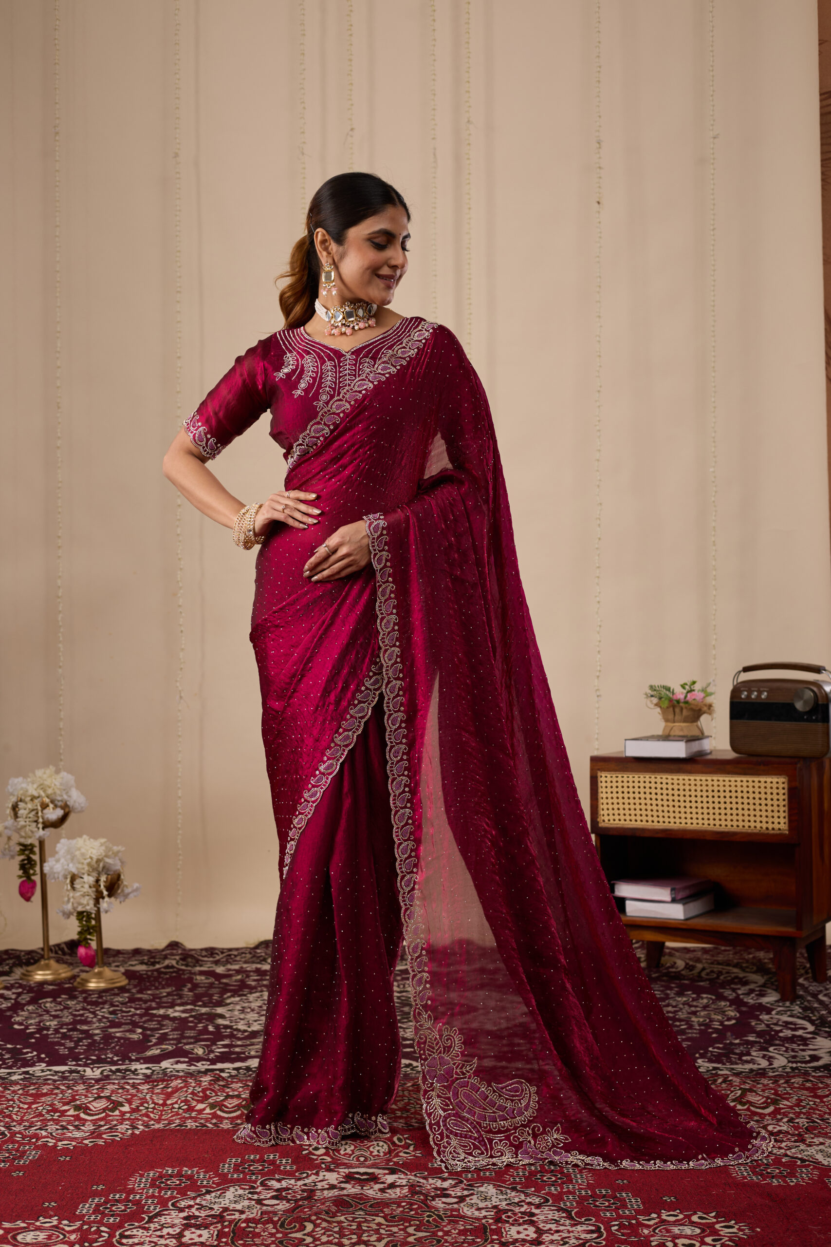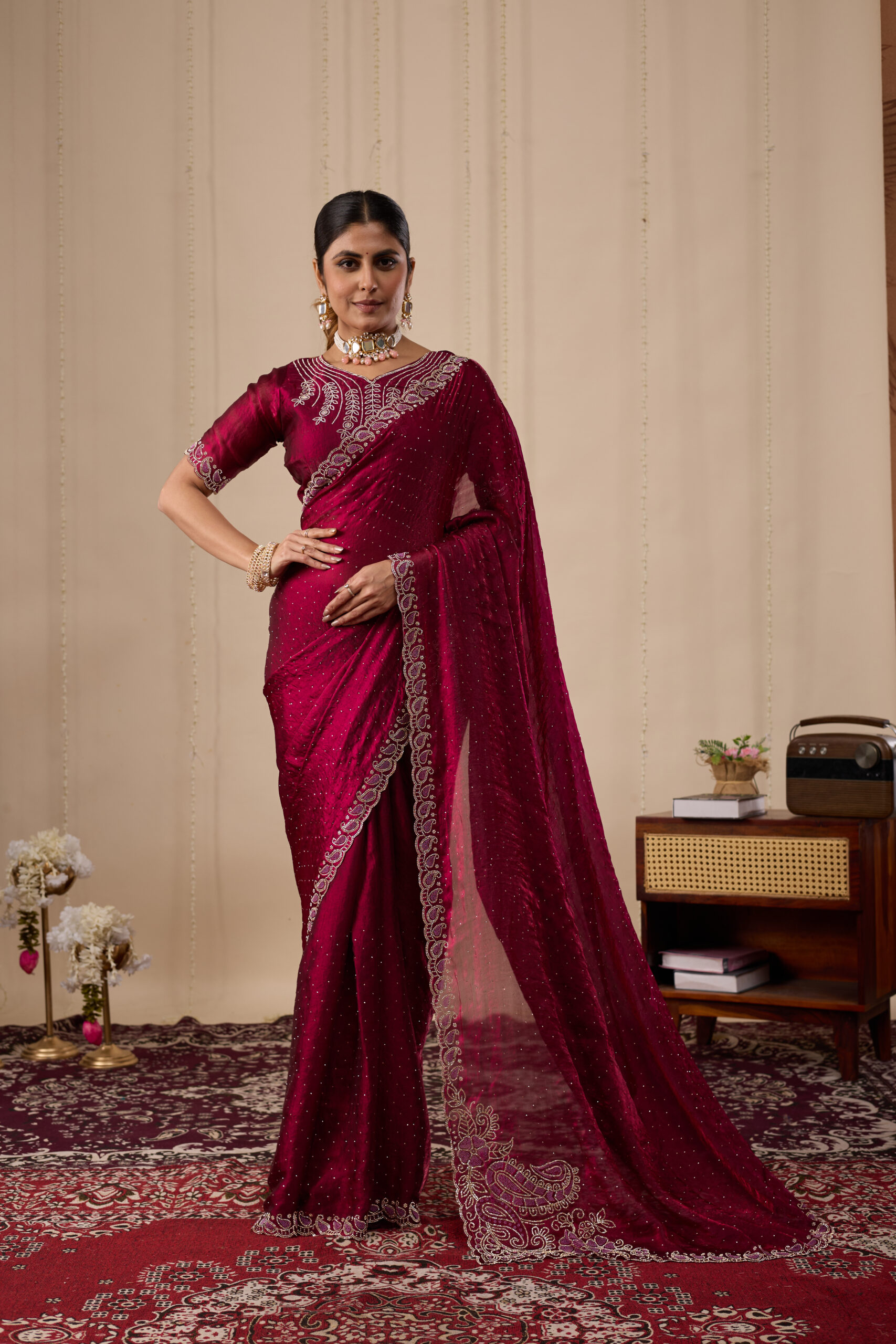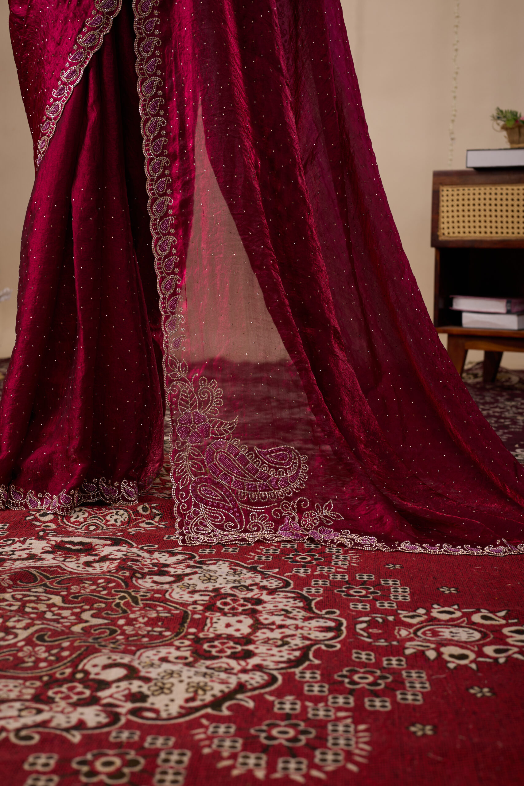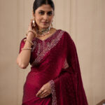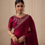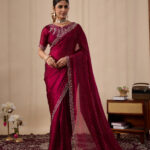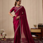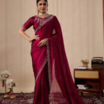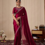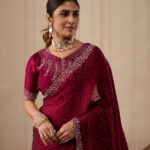 Premium velvet satin designer saree with elegant beads and handwork. Comes with 5.50 meter saree length and matching blouse piece. Suitable for party wear, wedding functions, and festive occasions.