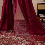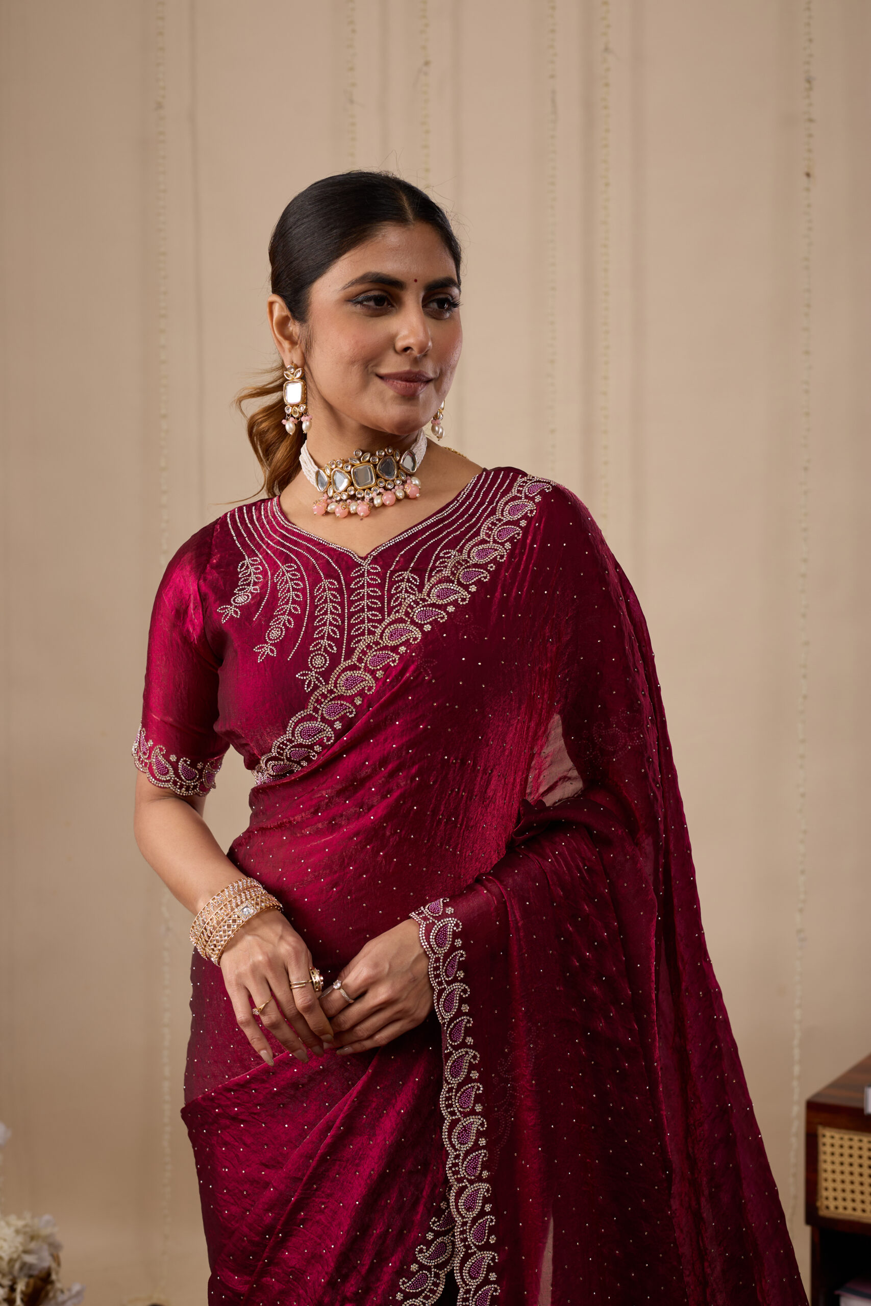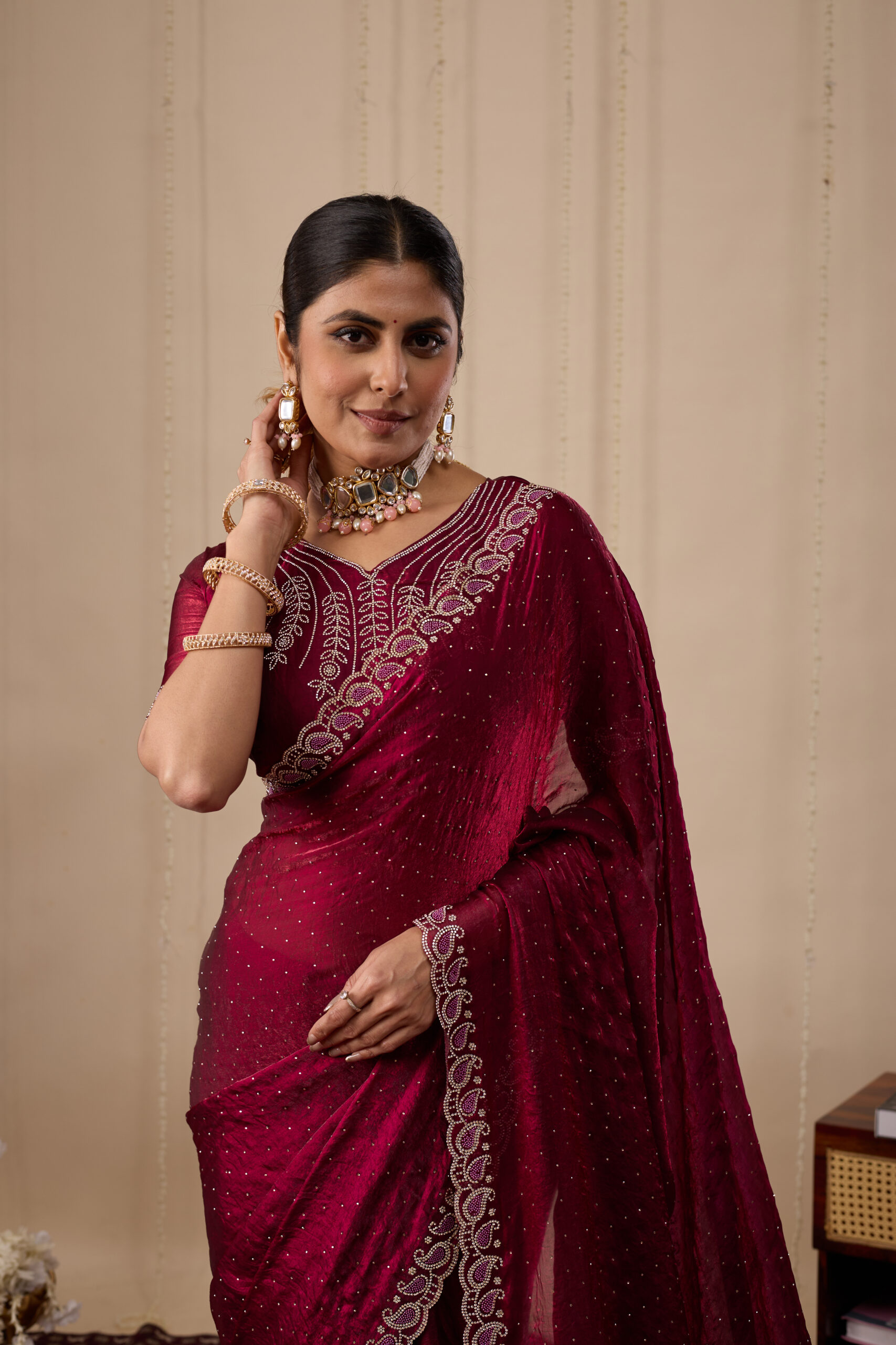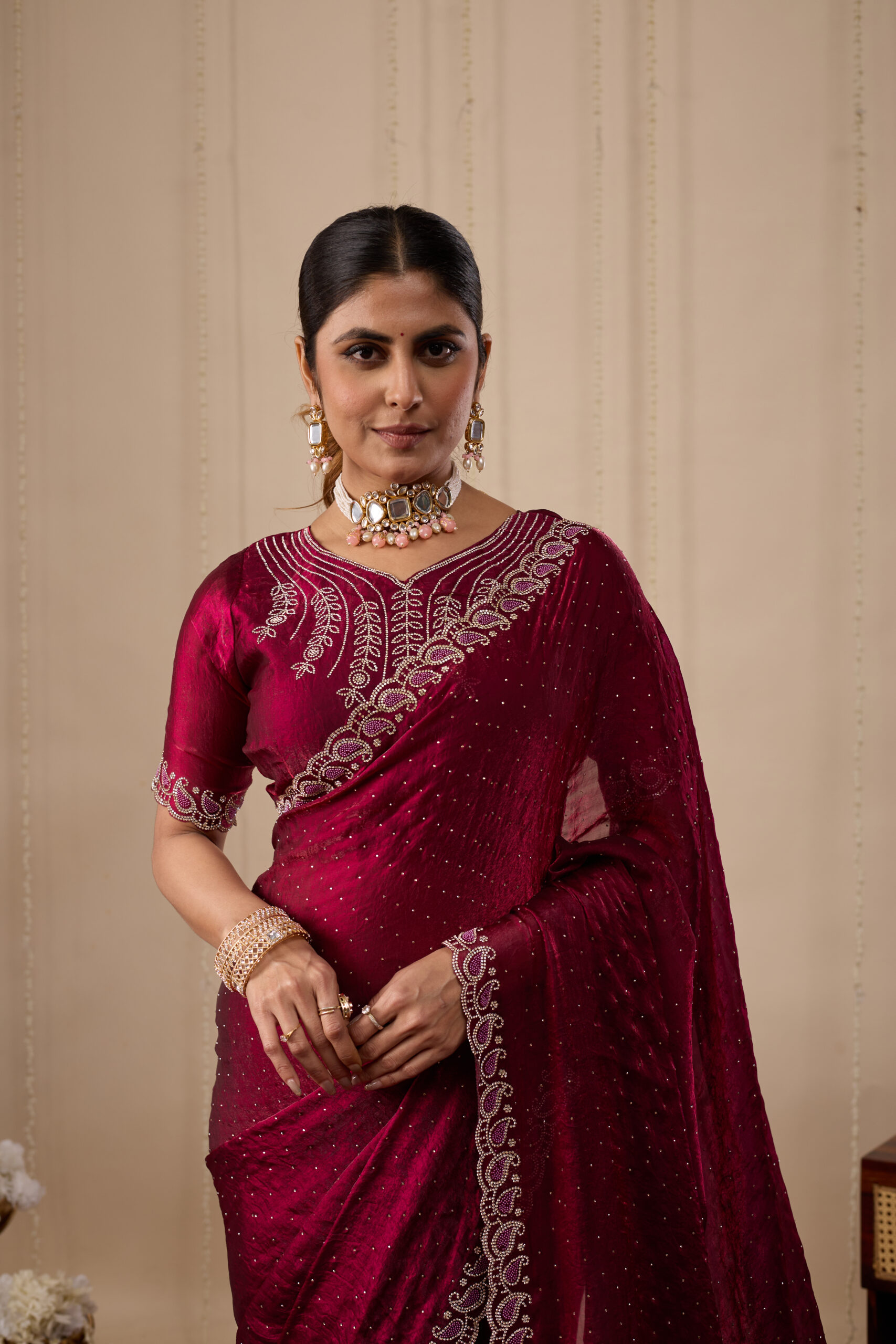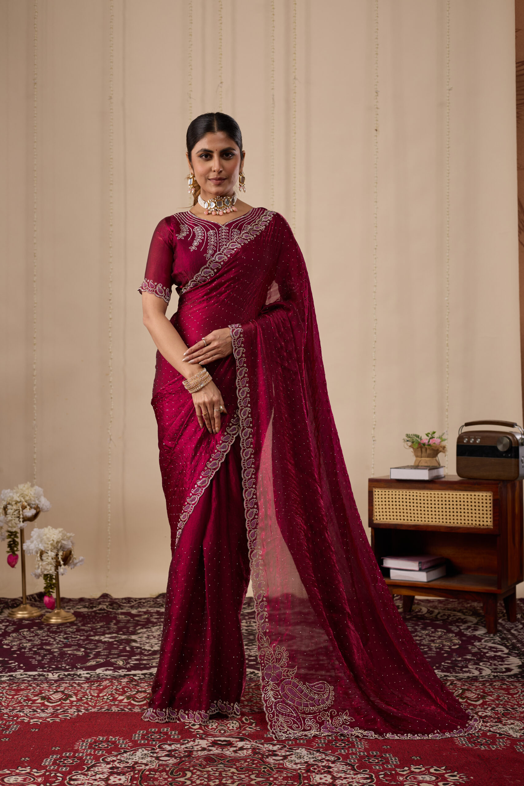 Premium velvet satin designer saree with elegant beads and handwork. Comes with 5.50 meter saree length and matching blouse piece. Suitable for party wear, wedding functions, and festive occasions.