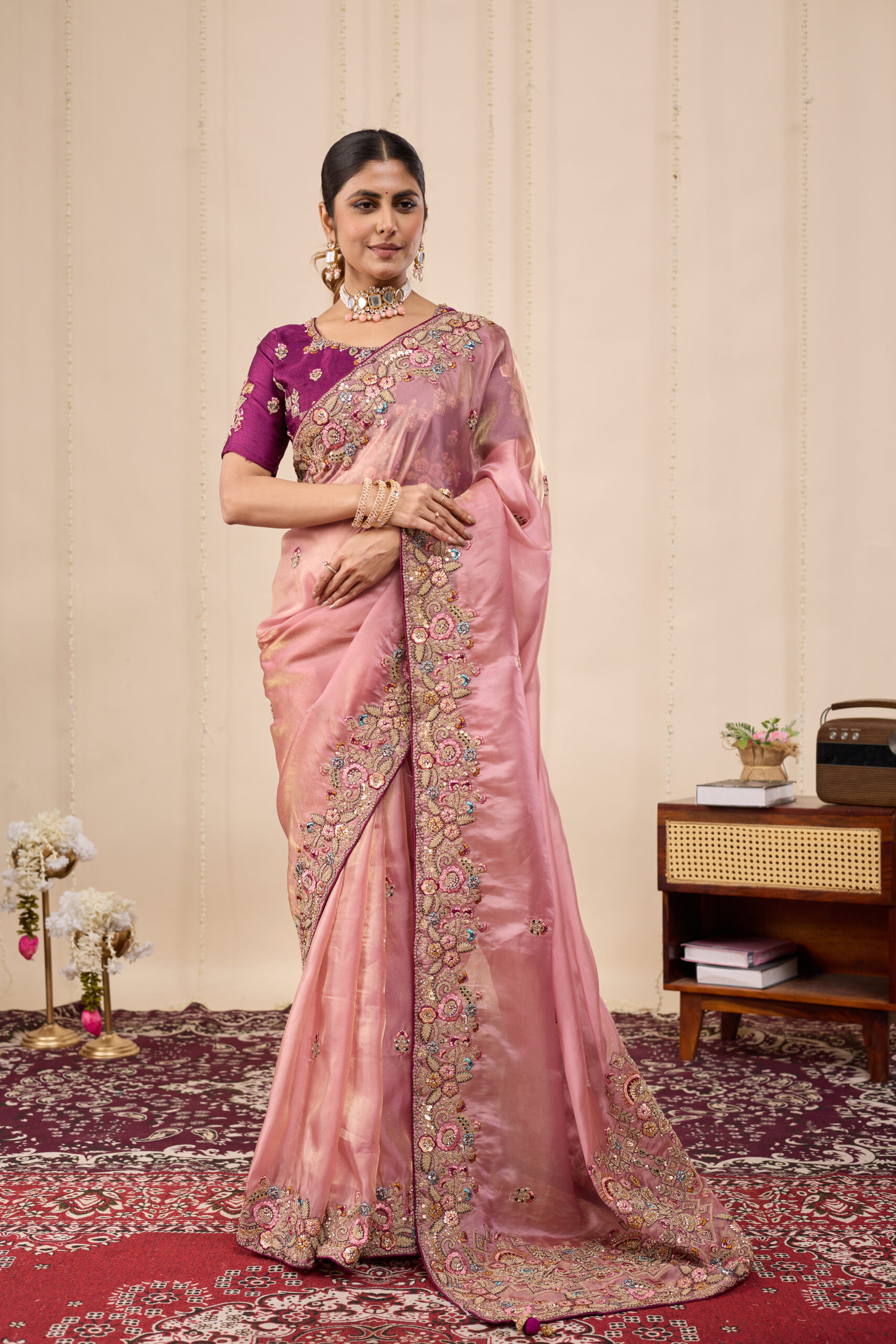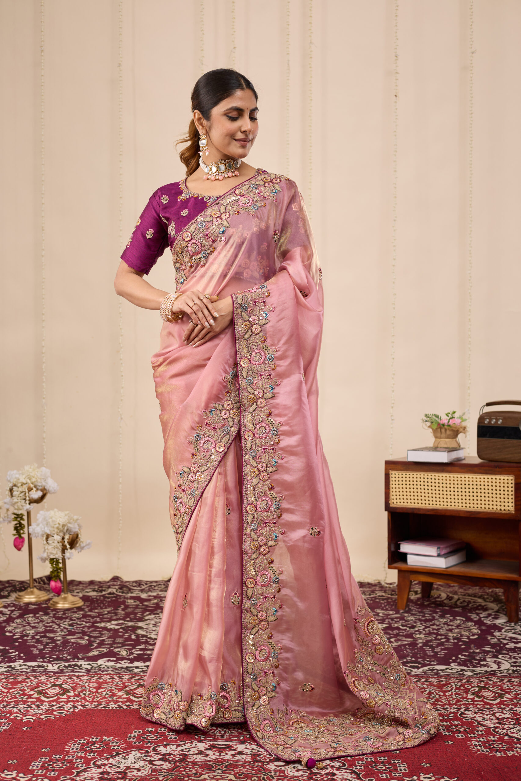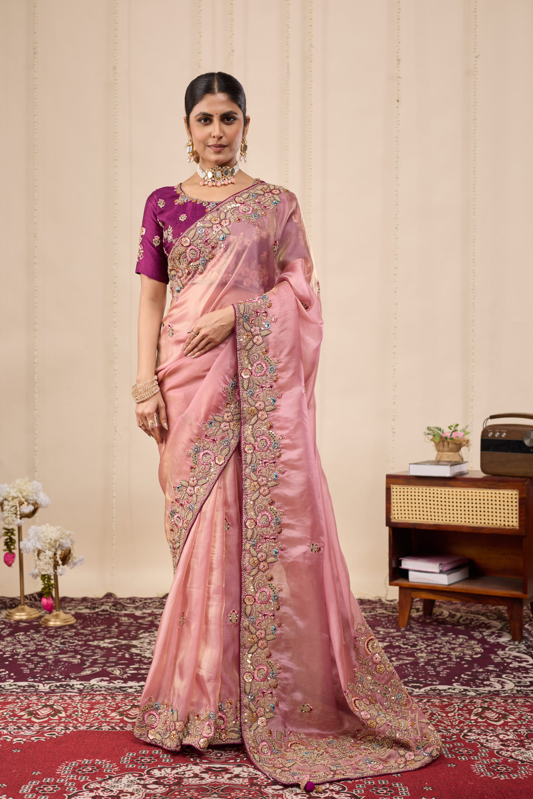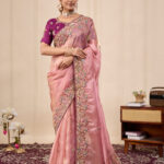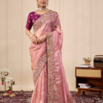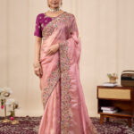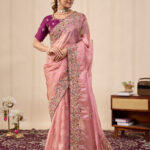 Premium velvet satin designer saree with elegant beads and handwork. Comes with 5.50 meter saree length and matching blouse piece. Suitable for party wear, wedding functions, and festive occasions.