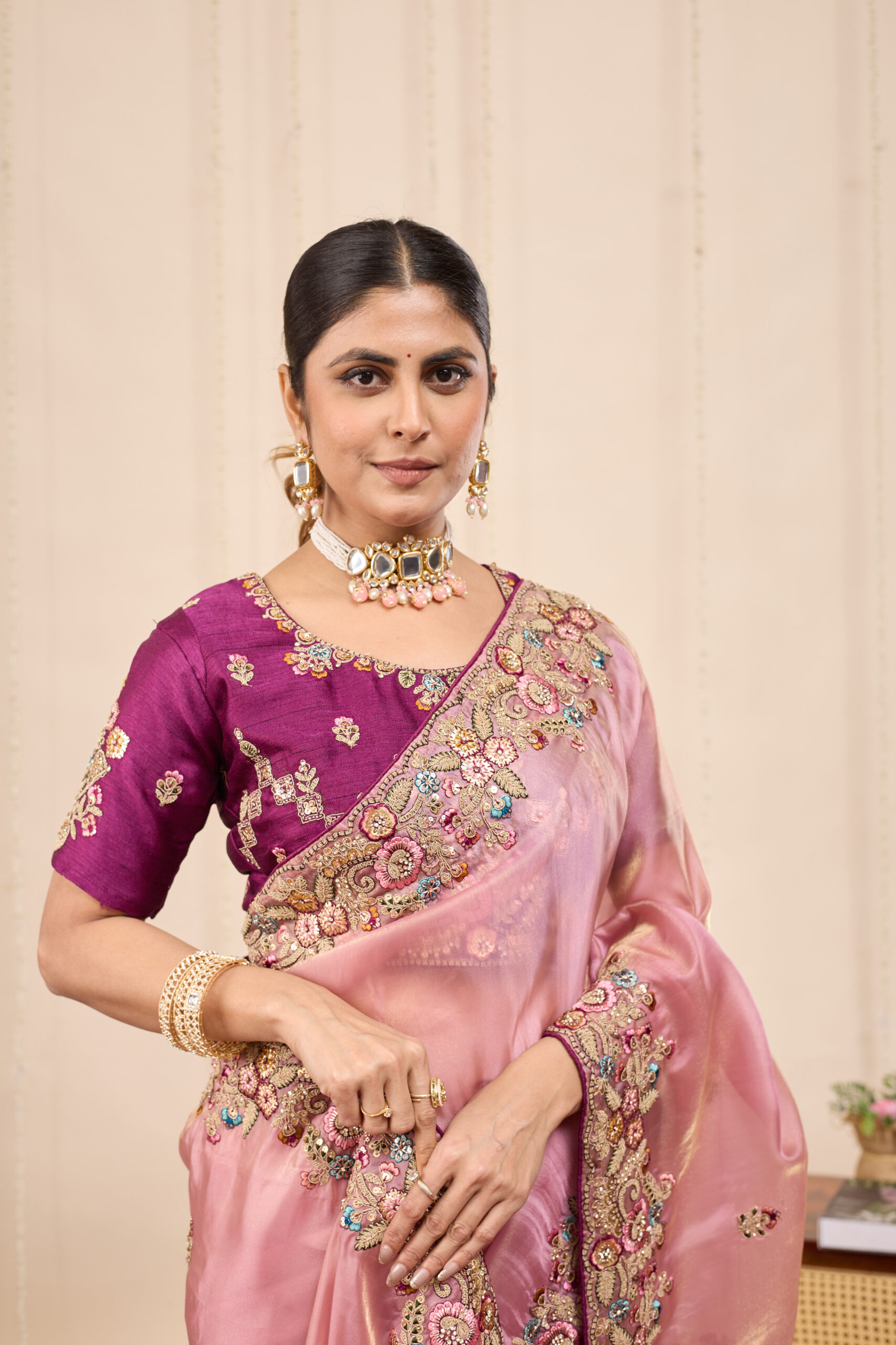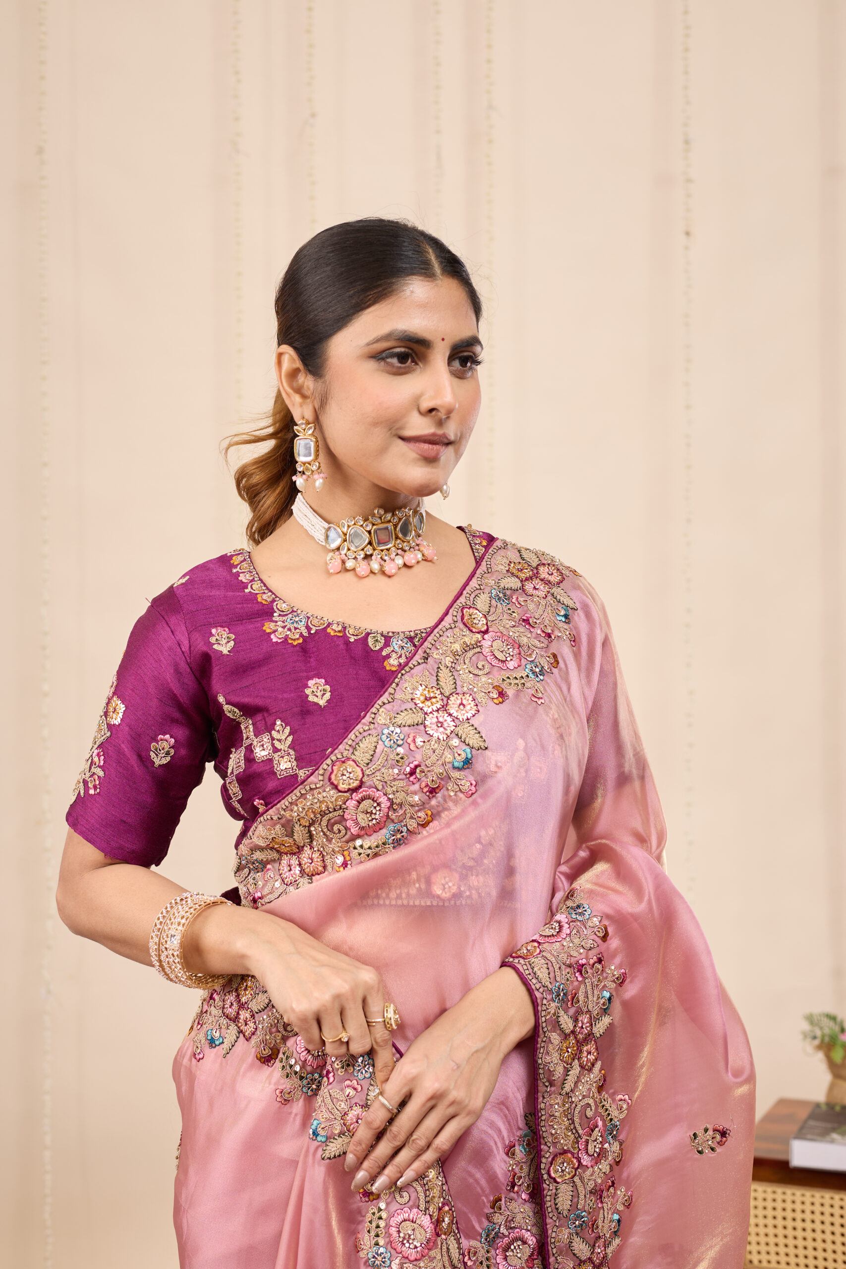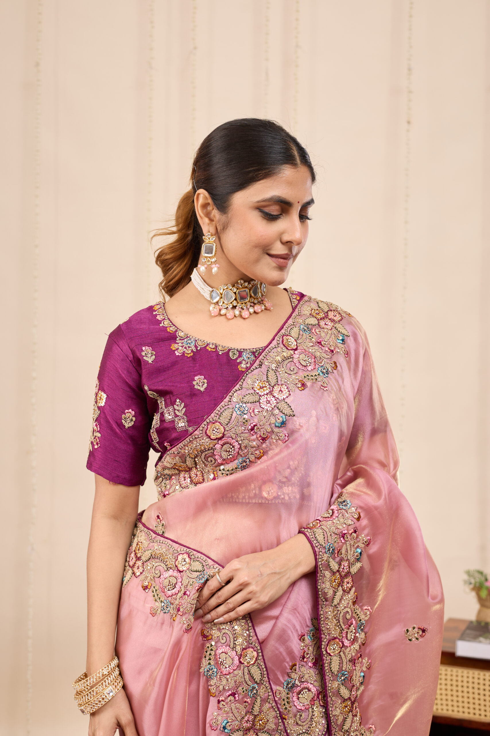 Premium velvet satin designer saree with elegant beads and handwork. Comes with 5.50 meter saree length and matching blouse piece. Suitable for party wear, wedding functions, and festive occasions.