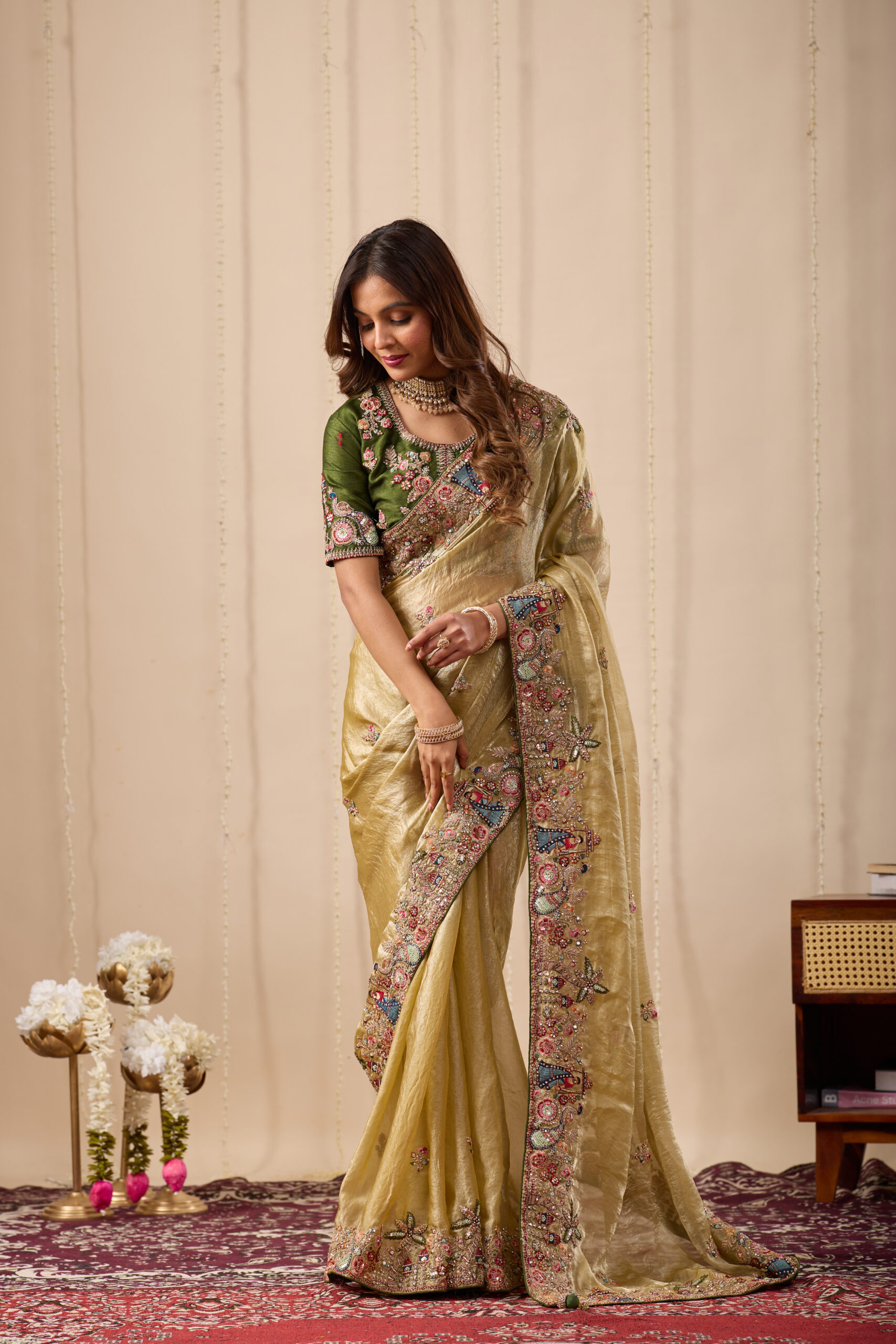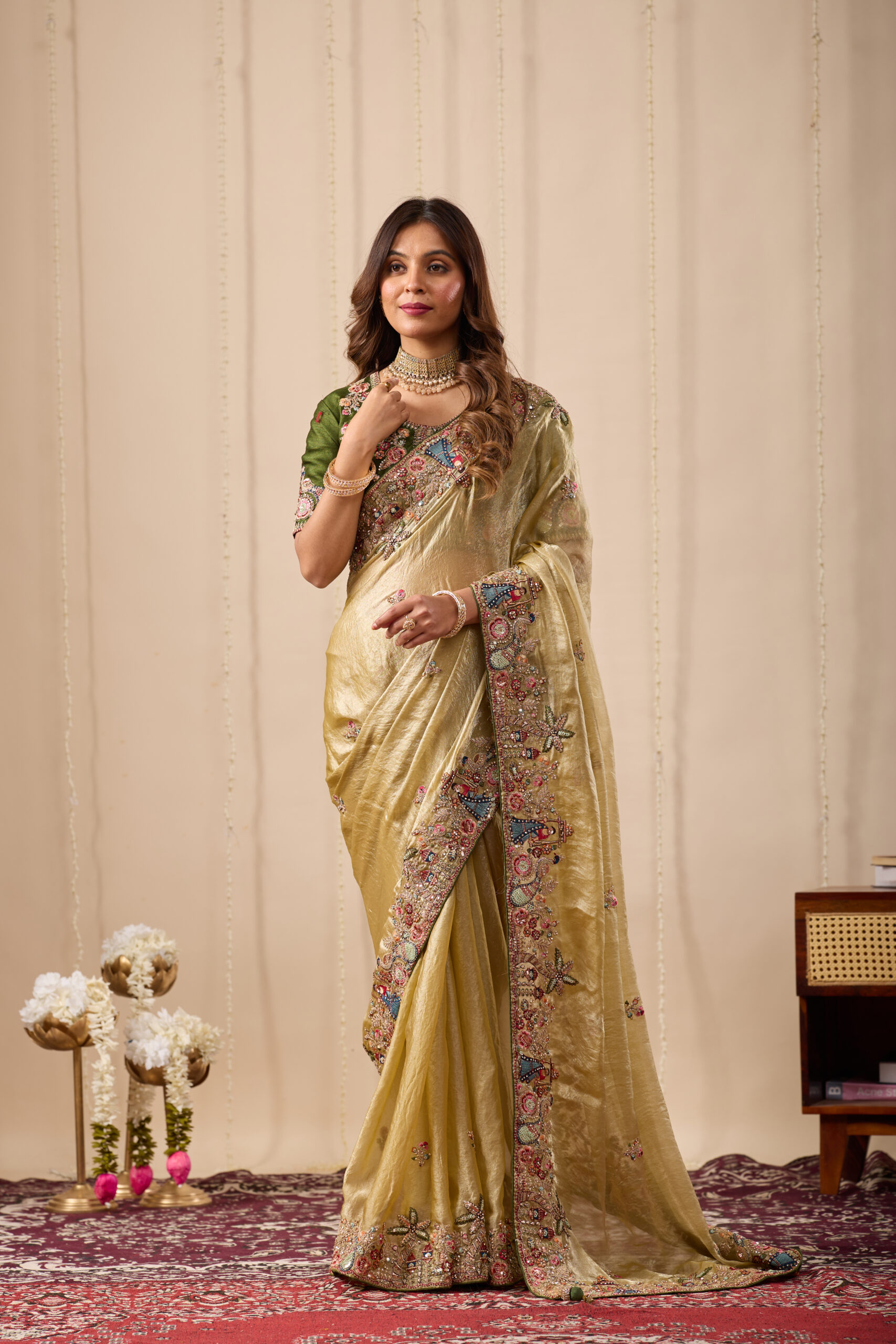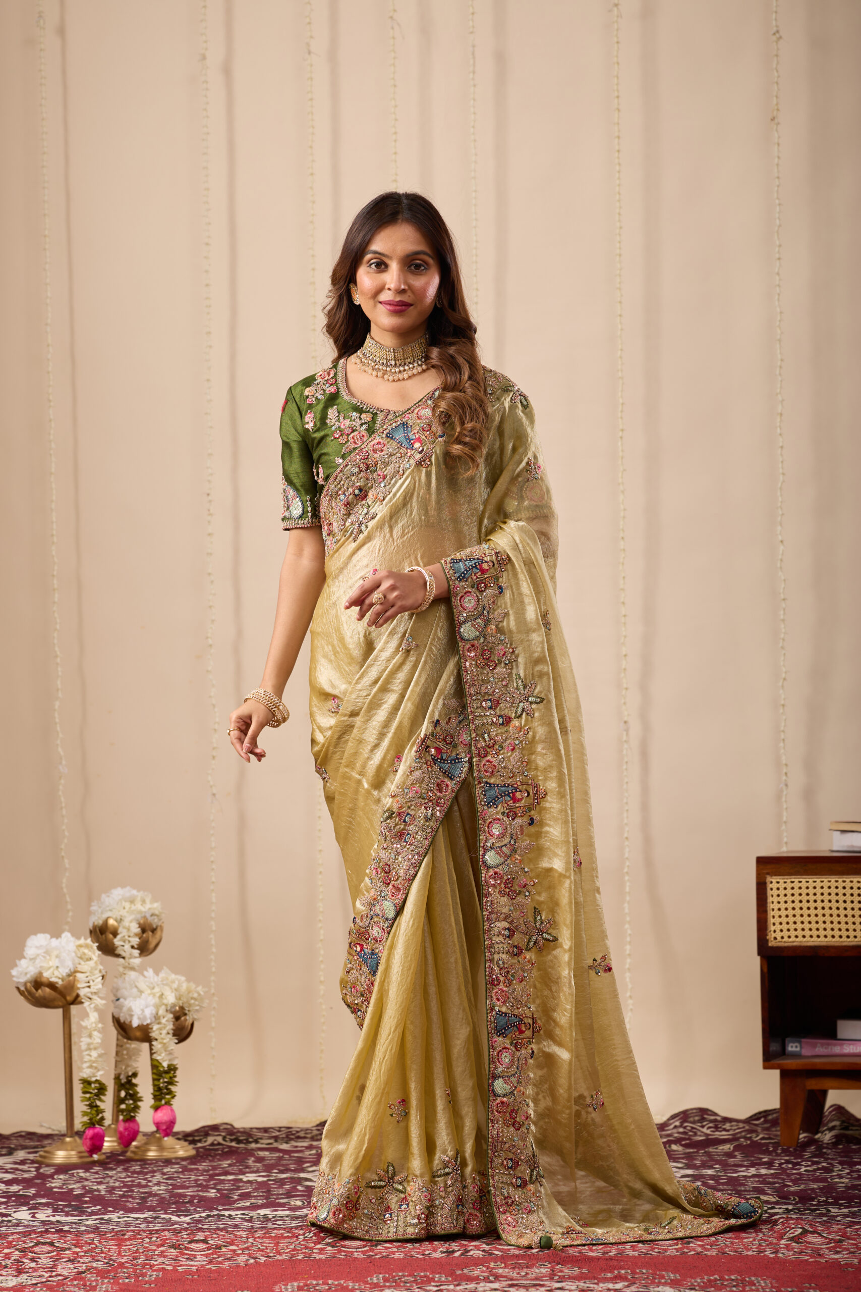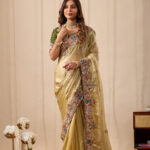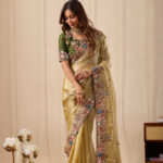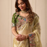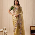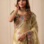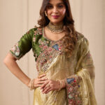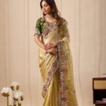 Premium velvet satin designer saree highlighted with elegant zardosi and jarkan Comes with 5.50 meter saree length and matching blouse piece. Ideal for party and festive wear.