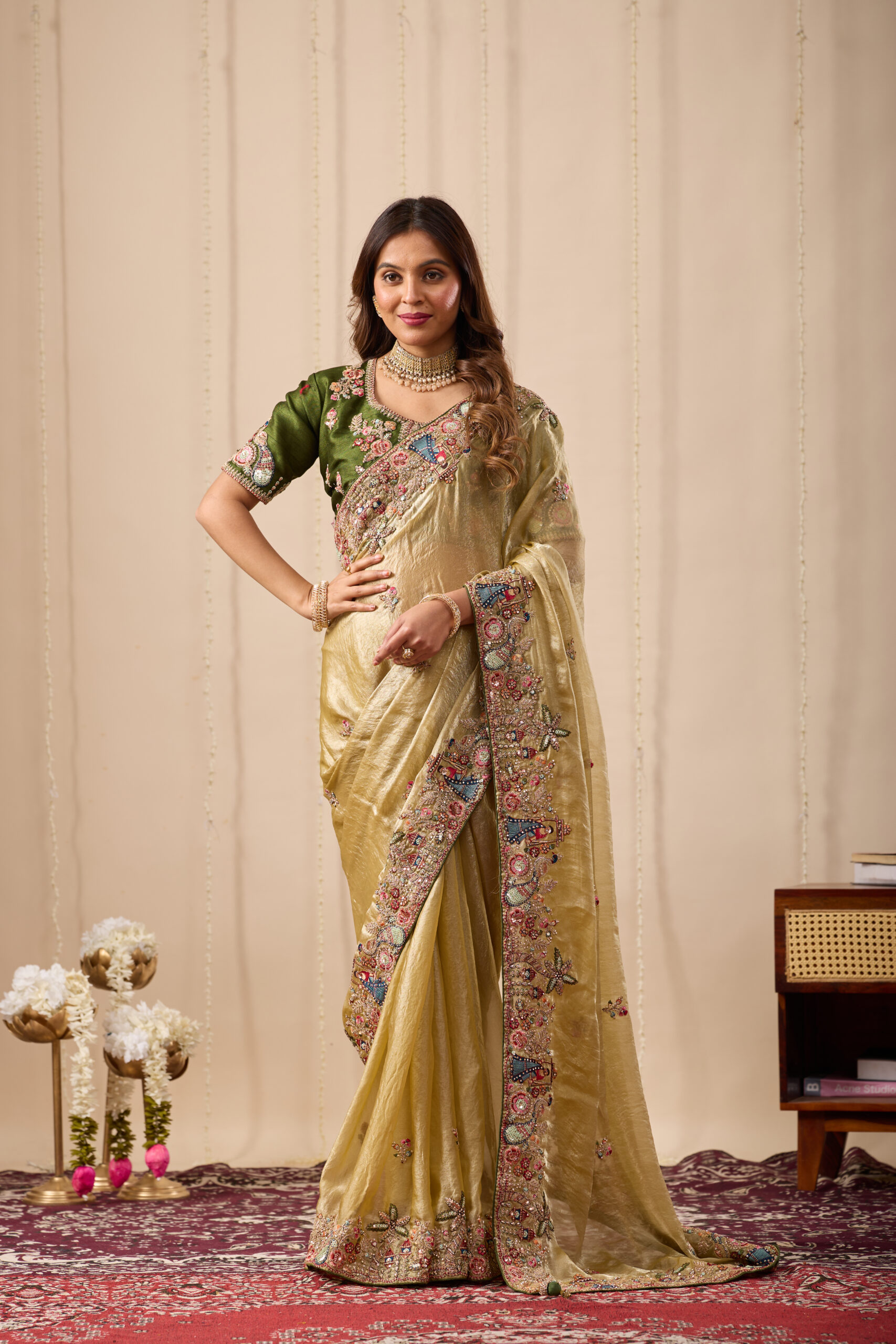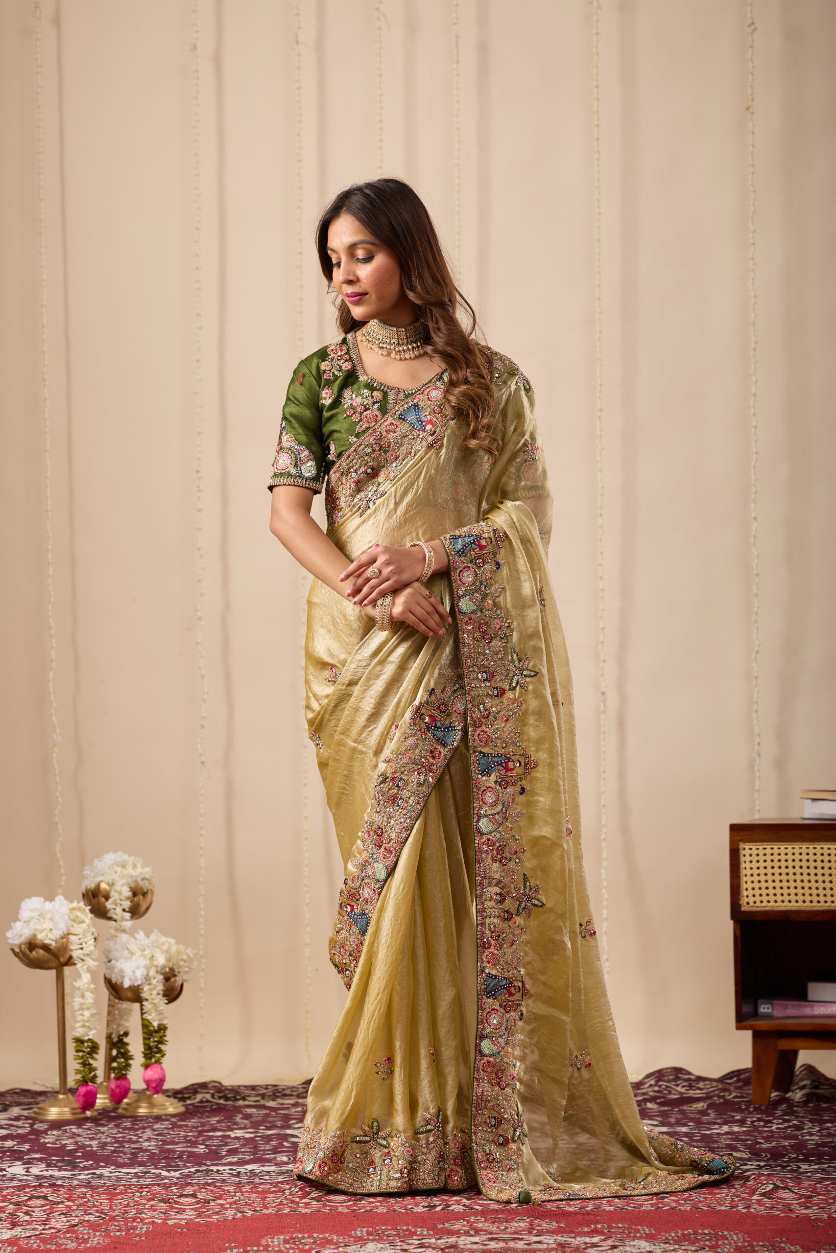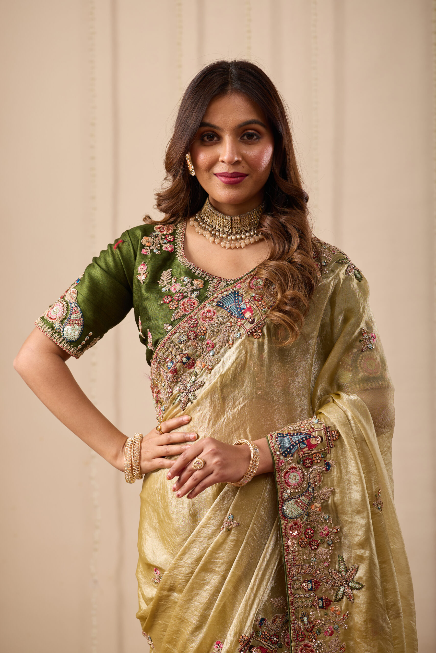 Premium velvet satin designer saree highlighted with elegant zardosi and jarkan Comes with 5.50 meter saree length and matching blouse piece. Ideal for party and festive wear.