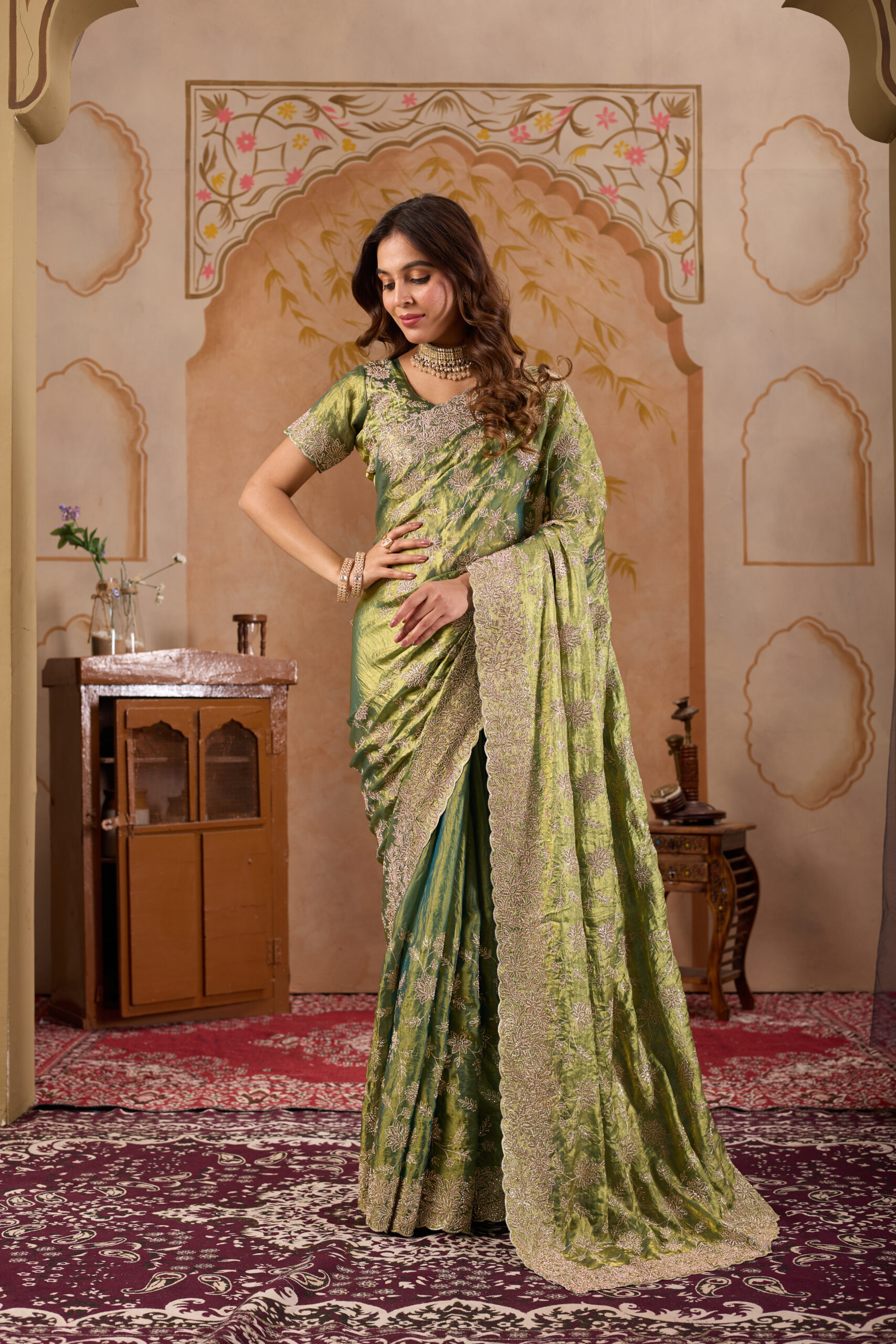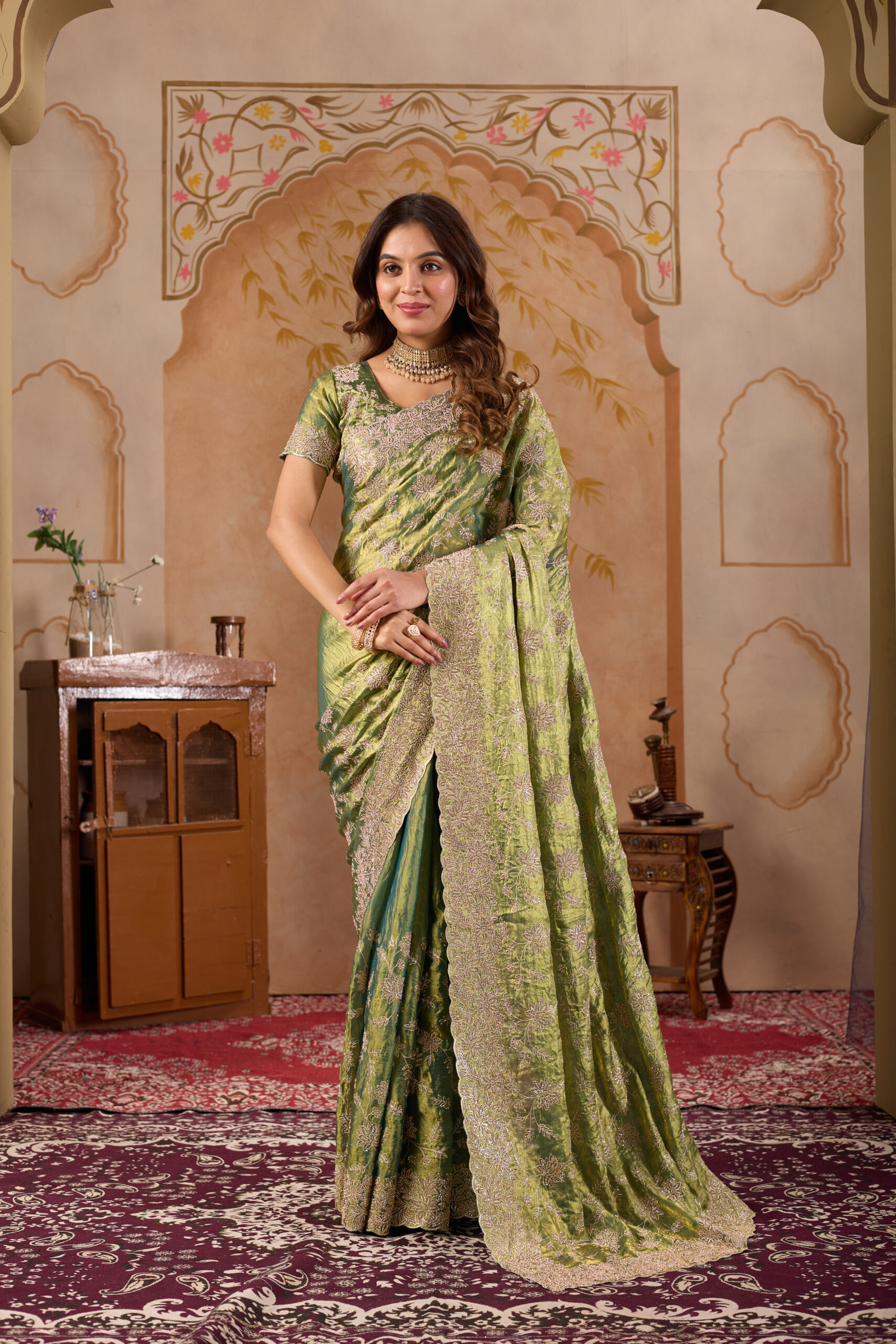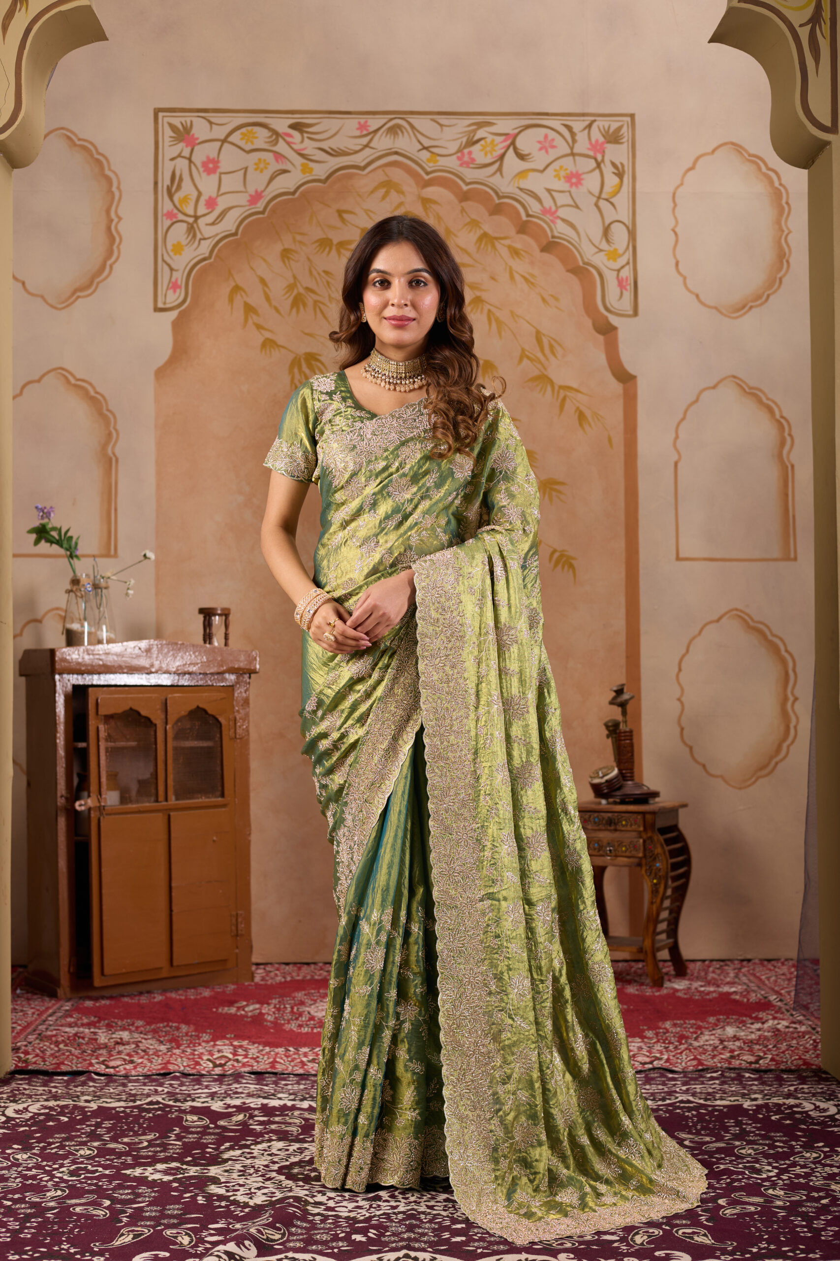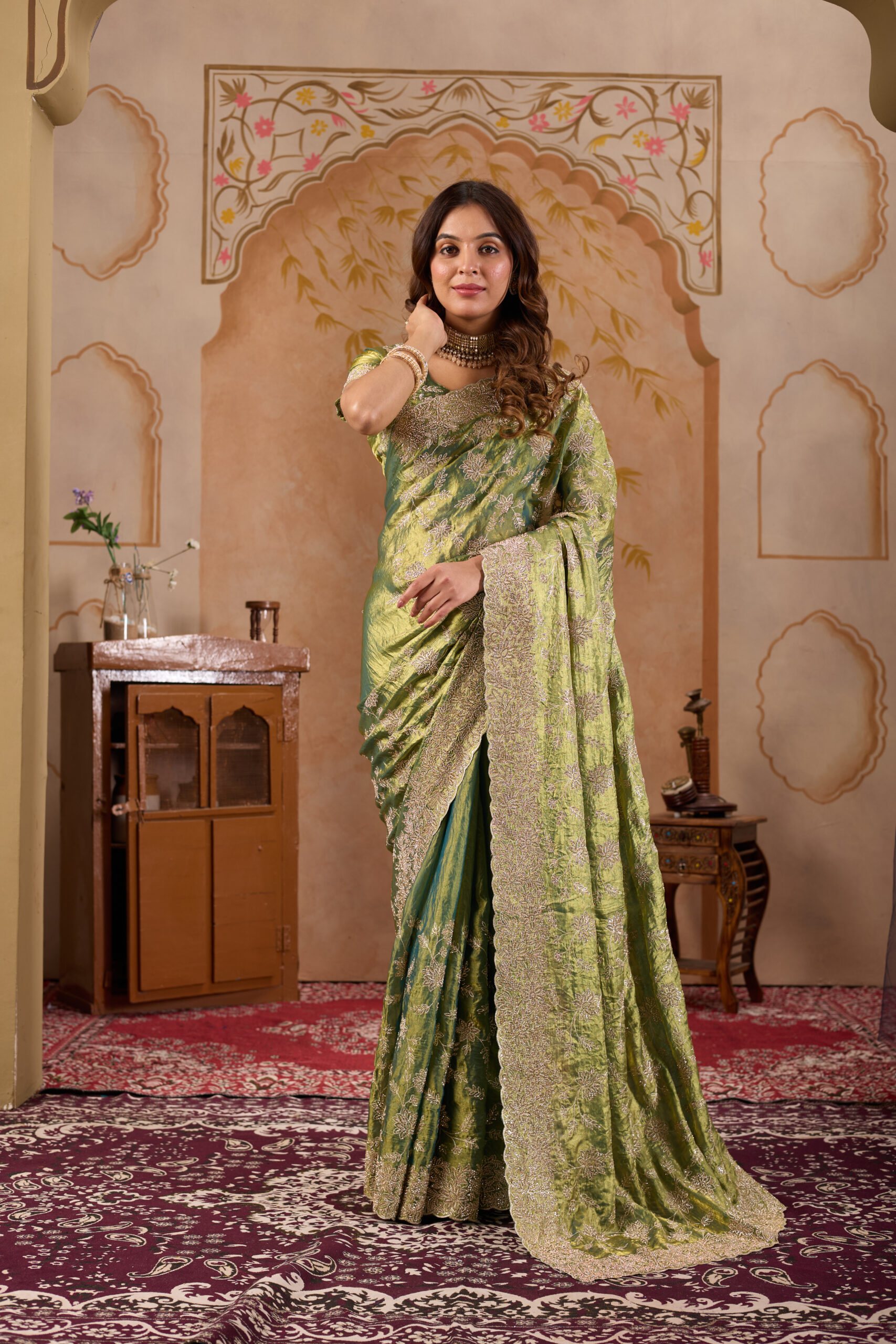 Luxurious velvet satin designer saree with beautiful zari and jarkan work. Comes with 5.50 meter saree length and matching blouse piece. Suitable for festive and wedding wear.