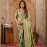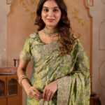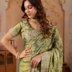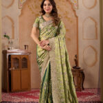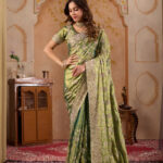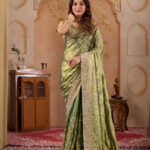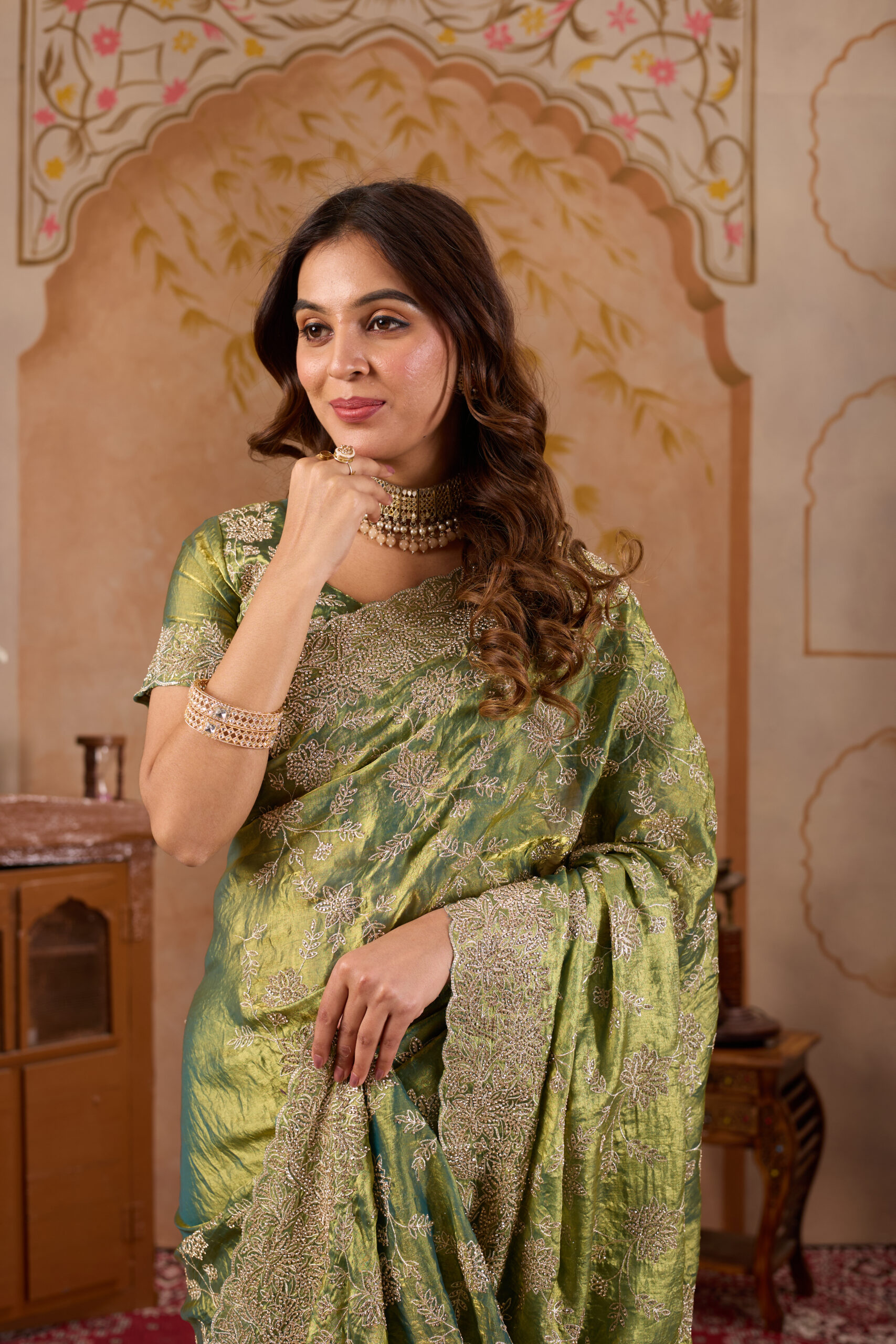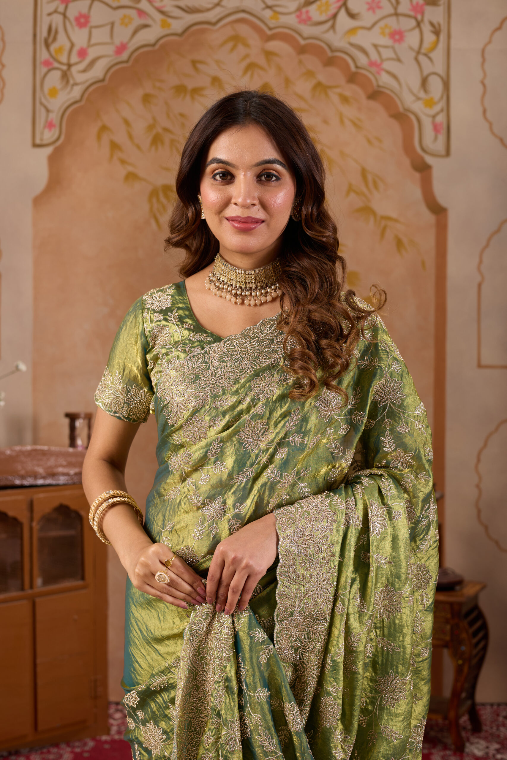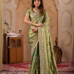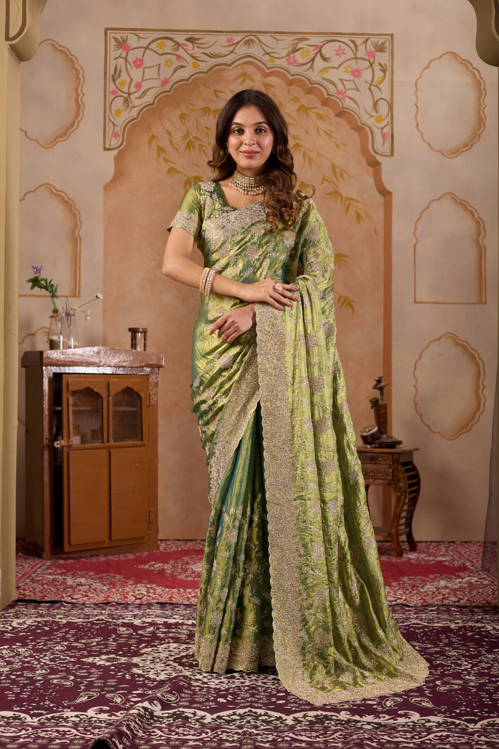 Luxurious velvet satin designer saree with beautiful zari and jarkan work. Comes with 5.50 meter saree length and matching blouse piece. Suitable for festive and wedding wear.