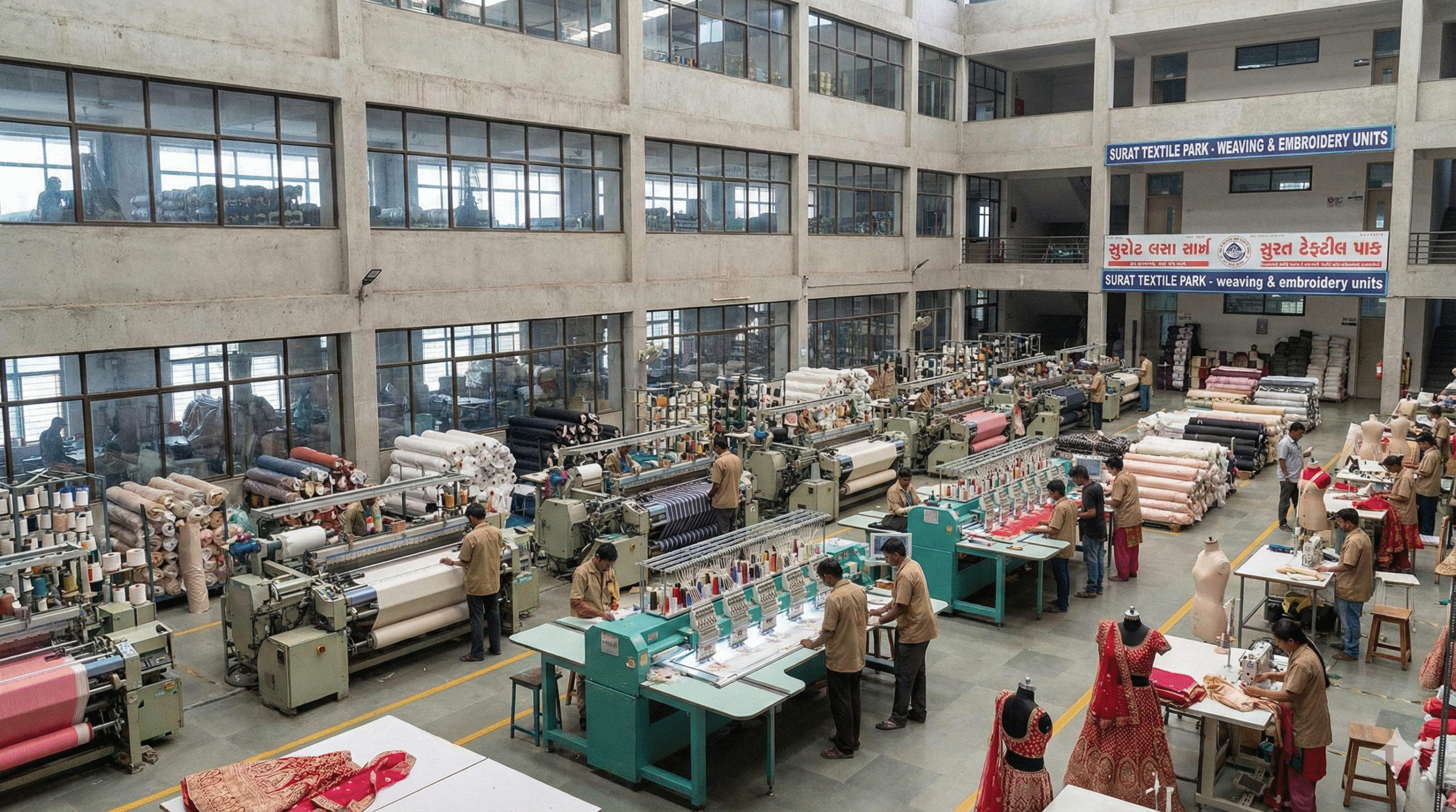 Textile factory workers stitching premium bridal lehengas in Surat