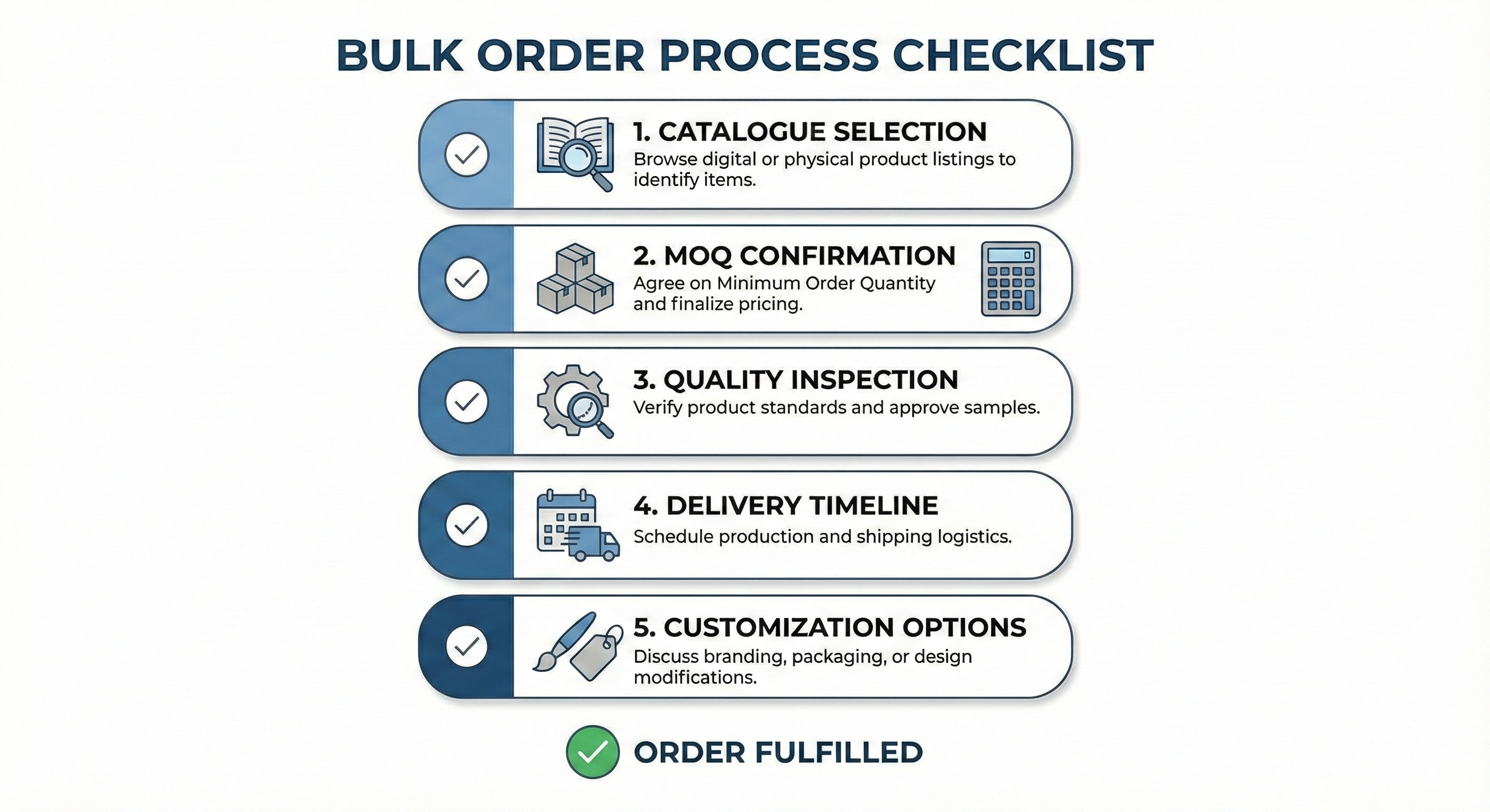 • Confirm MOQ (6–12 pieces minimum)